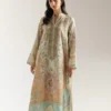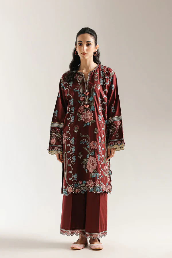 Experience the splendor of this exquisite embroidered suit, a fusion of rich color and delicate artistry. This stunning two-piece ensemble is crafted from a beautiful maroon fabric that serves as the perfect backdrop for its intricate design. The long shirt features elaborate, stylized floral and vine embroidery in a palette of light pink, blue, green, and white. The detailed threadwork and subtle sequin embellishments on the neckline, front, and sleeves create a look of opulent elegance. The suit is completed with matching trousers, making it an ideal choice for any festive event or special occasion.