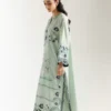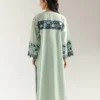 Discover the serene elegance of this beautiful embroidered suit. This stunning two-piece ensemble is crafted from a soft, light green fabric that serves as the perfect canvas for its intricate designs. The long shirt features elaborate floral and geometric embroidery in various shades of blue. The detailed motifs on the neckline, sleeves, and hem create a truly mesmerizing look. The suit is completed with matching trouser, making it a perfect choice for any occasion.