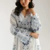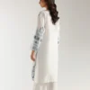 Embrace a breath of fresh elegance with this charming white & blue embroidered ensemble. The pristine white tunic features a graceful V-neckline, beautifully adorned with intricate embroidery in various shades of blue, creating captivating floral and geometric patterns across the front. The full-length sleeves are a highlight, showcasing elaborate embroidered motifs that echo the designs on the tunic’s body, adding to its sophisticated appeal. Complementing this stunning shirt are perfectly tailored straight trousers in matching white, which feature a coordinating embroidered border at the hem, creating a cohesive and effortlessly elegant silhouette. Perfect for festive celebrations, daytime gatherings, or any occasion where you desire to exude serene grace and artistic flair.