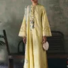 - Shirt: Lemon yellow jacquard lawn panelled shirt with crew neckline, tassels, bell sleeves, and self/white embroidery details.