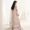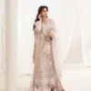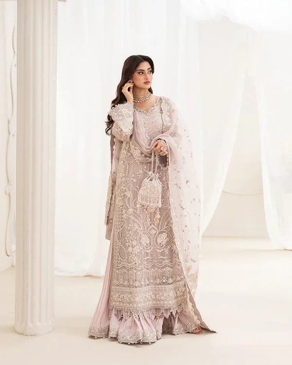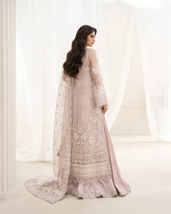 Infused with a sense of luminous grace, Ela stands out for its sculpted yet fluid silhouette. Crafted from buttery organza in a delicate dusty rose hue, the embellished shirt and embroidered silk trousers create a play of light and movement in a layered composition. Paired with an embroidered organza dupatta, this ensemble radiates a dreamlike finesse that will add a touch of glam to your celebrations.