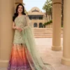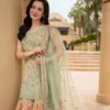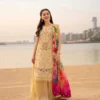Infused with graceful allure and artistic finesse, Eldira reflects contemporary sophistication. Crafted in refreshing mint green with soft peach and lilac accents, the lawn shirt is delicately ornamented with fine embroidery. Teamed with a matching bottom and a diaphanous net dupatta, this ensemble ensures you turn heads wherever you go.