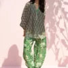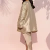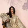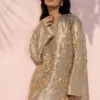 This luminous champagne gold ensemble features a short tissue shirt fully enveloped in tonal zardoze embroidery, forming an ornate tapestry of floral and vine motifs. The richly worked top is paired with matching charmeuse shalwar in a fluid tulip-inspired drape, creating a cohesive and softly sculpted silhouette.