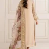 Elevate your wardrobe with this stunning three-piece ensemble featuring premium embroidered chiffon. The frock showcases delicate hand-crafted neckline detailing paired with intricate embroidery, while the coordinating dupatta in embroidered printed organza adds graceful movement and sophistication. Comfortable grip trousers complete the look with an embroidered patch accent. This complete set arrives with all accessories, making it ready to wear for any special occasion or celebration.