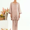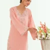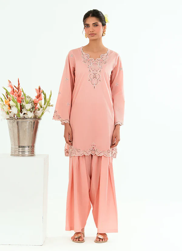 A soft coral cotton embroidered co ord set designed in a relaxed silhouette for effortless everyday elegance. The top features delicate embroidery along the neckline and hem, adding feminine detail with a graceful finish. Paired with a relaxed shalwar that offers comfort and easy movement, this set feels light, fresh, and versatile perfect for daytime outings, casual gatherings, and refined everyday dressing.