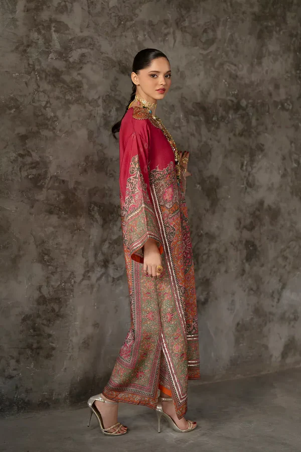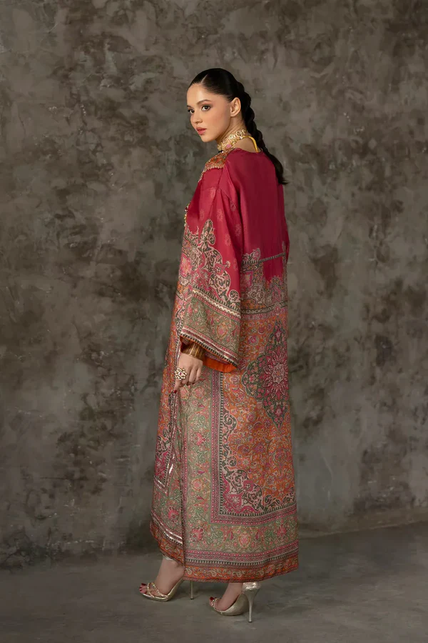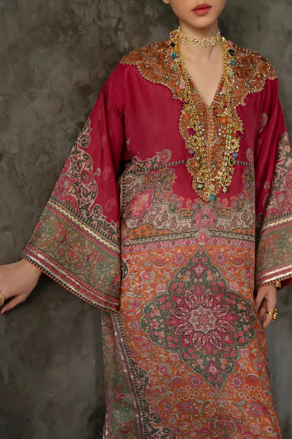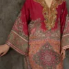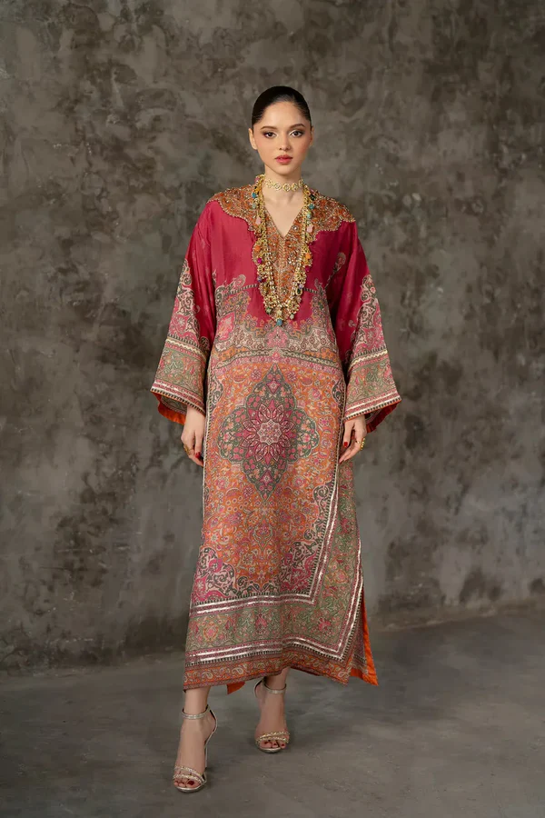 Make a grand entrance in this luxurious embellished kaftan. Featuring an opulent, sequin-drenched neckline and intricate traditional motifs across the flowing silhouette, this piece exudes bohemian royalty. The floor-length design and wide sleeves are framed by shimmering metallic borders, creating a captivating look that seamlessly blends artisanal heritage with high-fashion drama.
