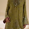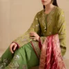 Dazzle with opulence in this magnificent moss green embroidered suit. The straight-cut shirt is crafted from a subtle green fabric and is extravagantly adorned with heavy silver and gold sequin work, scattered across the entire bodice and sleeves. The neckline features elaborate beading and tassel details, while the wide, full-length sleeves are finished with a rich border. The ensemble is elevated by contrasting dark green shalwar. The shalwar boast a heavy, ornate border of gold and sequin embroidery at the hem, creating a regal and balanced silhouette. A deep pink, richly woven dupatta with gold borders completes this luxurious look, making it a perfect statement piece for formal or wedding festivities.