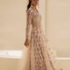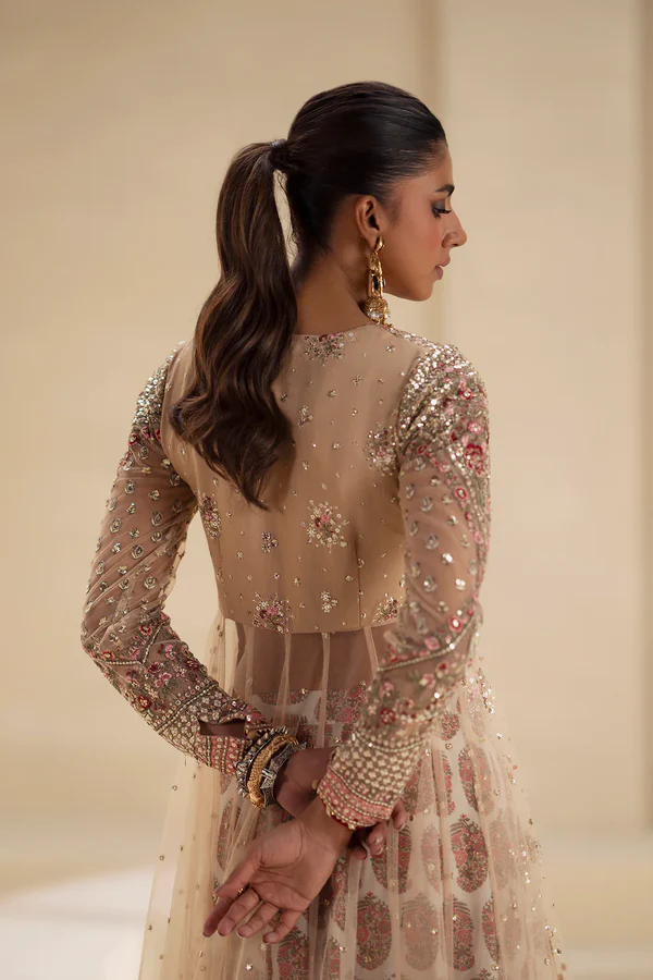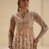 Step into the spotlight with this ethereal gold Dazzle in ethereal beauty with this show-stopping beige embroidered set, featuring a long shirt and a coordinated skirt. The sheer, long-sleeved shirt is crafted from a light net or chiffon in a soft beige hue. It is utterly submerged in luxurious embellishments, including dense sequins, threadwork, and beading in gold, silver, and soft pink. The bodice is intricately worked, transitioning into a full, flowing skirt that is covered in scattered motifs and glittering detail. This opulent piece is layered over a skirt that features a white and pink print visible beneath the sheer overlay. This majestic ensemble is a perfect centerpiece for a grand wedding or high-end formal event.