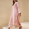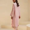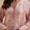 Drape yourself in delicate beauty with this gorgeous dusty rose embroidered suit. The long, straight-cut kurti is crafted from a soft pink fabric and features exquisite tonal and contrasting green and pink thread embroidery in a detailed floral vine and stylized pattern down the front. Scattered gold sequins add a subtle festive shimmer to the kurti, which is finished with a thin red trim on the neckline and cuffs. The ensemble is completed by straight-fit trousers in a contrasting white with an ornate embroidered paisley border at the hem. This suit offers a sophisticated and elegant look perfect for any special occasion.