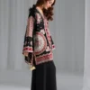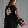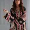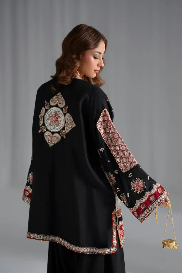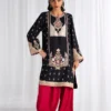 This striking black kurta commands attention with its opulent embroidery inspired by Kashmiri and Mughal heritage. Rich embroidery in vibrant red, cream, pink, and green adorns the garment with intricate floral and paisley motifs, creating a dramatic contrast against the dark base. The design concentrates along a wide vertical center front panel, extending to the cuffs and shoulder areas, establishing a sophisticated frame. The V-neckline provides elegant definition, while voluminous long sleeves offer graceful movement and visual impact. This expertly crafted piece merges traditional artistry with contemporary silhouettes, making it an exceptional choice for formal celebrations, weddings, and occasions where bold elegance is desired.