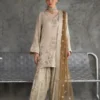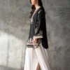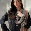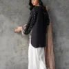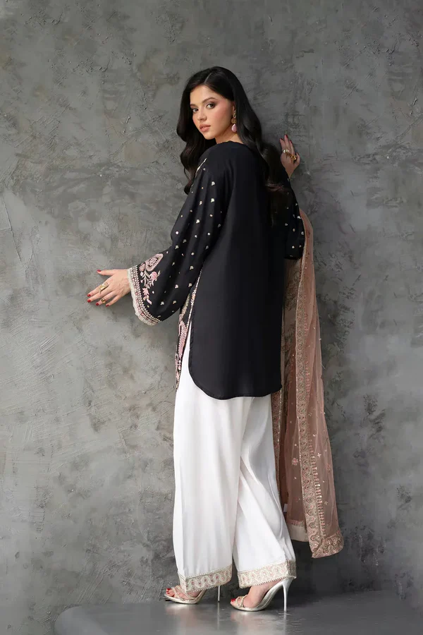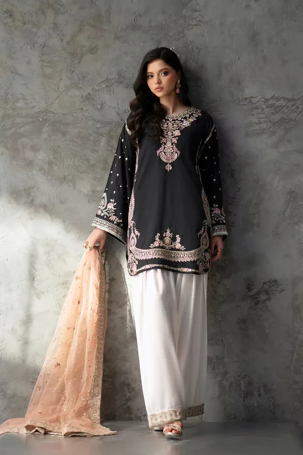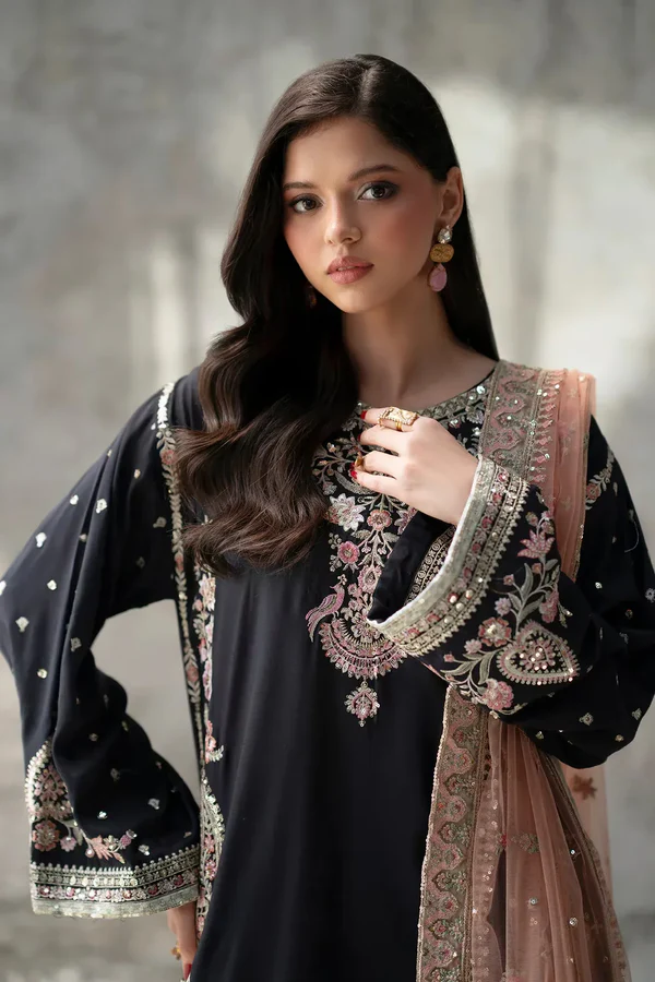 Command attention in this classic black embroidered suit. The shirt is beautifully detailed with soft pink floral threadwork and delicate silver accents along the neckline and hem. Paired with crisp white shalwar and a sheer peach dupatta featuring ornate borders, this ensemble offers a timeless, high-contrast look that is both graceful and sophisticated.