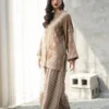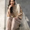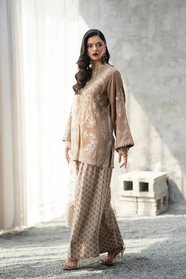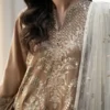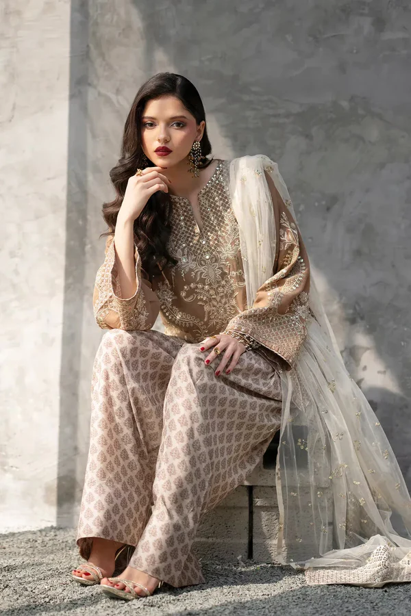 Elevate your evening wardrobe with this breathtaking taupe embroidered suit. The shirt is masterfully adorned with shimmering silver tilla and sequins that catches the light with every movement. Completed with patterned flared shalwar and a delicate net dupatta featuring matching embellished borders, this ensemble is a true testament to refined artisanal luxury and graceful style.