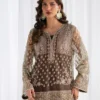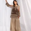 This exquisite embroidered suit showcases traditional craftsmanship at its finest. The kurta is crafted from rich, dark brown fabric, with a meticulously lined body and sheer sleeves, creating an elegant silhouette. Intricate embroidery in soft pink and bronze metallic threads adorns the front, neckline, and bell sleeves, with a striking banded border detail at the hemline. The straight-cut design falls gracefully to mid-thigh, while the wide-leg palazzo trousers complete the sophisticated ensemble. Perfect for formal occasions and celebrations, this piece combines timeless elegance with contemporary styling.