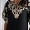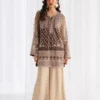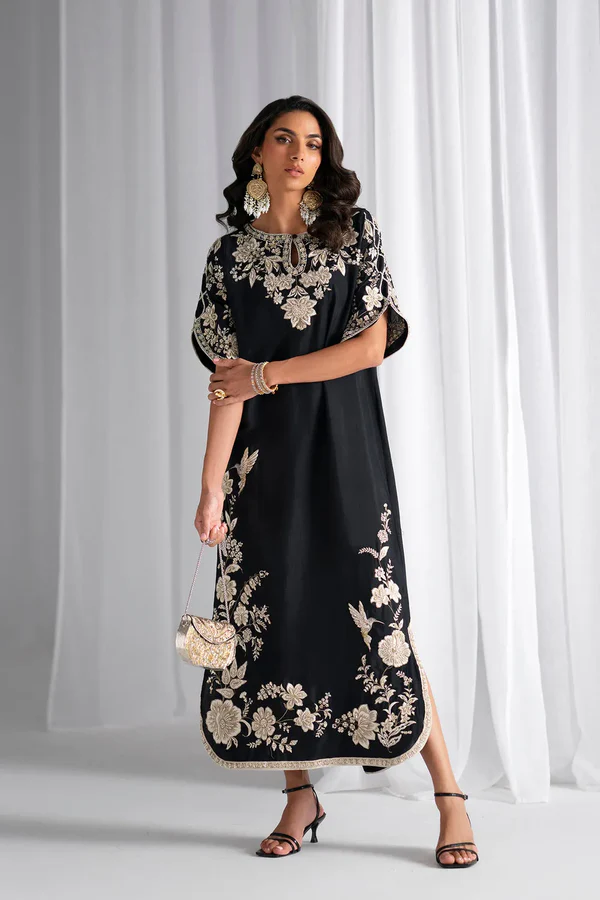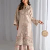 This exquisite embroidered kaftan features a strategically lined torso with ethereal sheer sleeves, balancing structure and fluidity. Masterfully executed traditional embroidery in soft pink and bronze metallic threads adorns the front placket, neckline, and full-length sleeves, creating an intricate tapestry of patterns. The hemline showcases a meticulously crafted banded border, while the relaxed silhouette drapes elegantly to mid-thigh. Designed as part of a complete three-piece ensemble with coordinating shalwar and dupatta, this kaftan represents timeless craft.