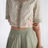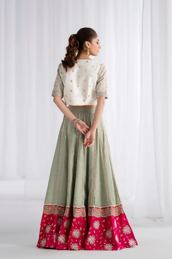 This vibrant lehenga choli ensemble captures festive elegance through its harmonious color palette and meticulous embellishment. The cropped choli in off-white or light sage green features a rounded neckline and short sleeves, adorned with all-over gold sequins, beads, and delicate pink or coral floral embroidery that creates rich textural depth. The dramatic contrasting border in bright magenta or fuchsia at the hem provides striking visual impact and festive energy. This expertly balanced composition merges traditional craftsmanship with contemporary color sensibilities, making it an ideal choice for weddings, celebrations, and formal occasions demanding vibrant elegance.