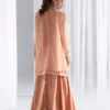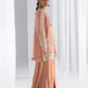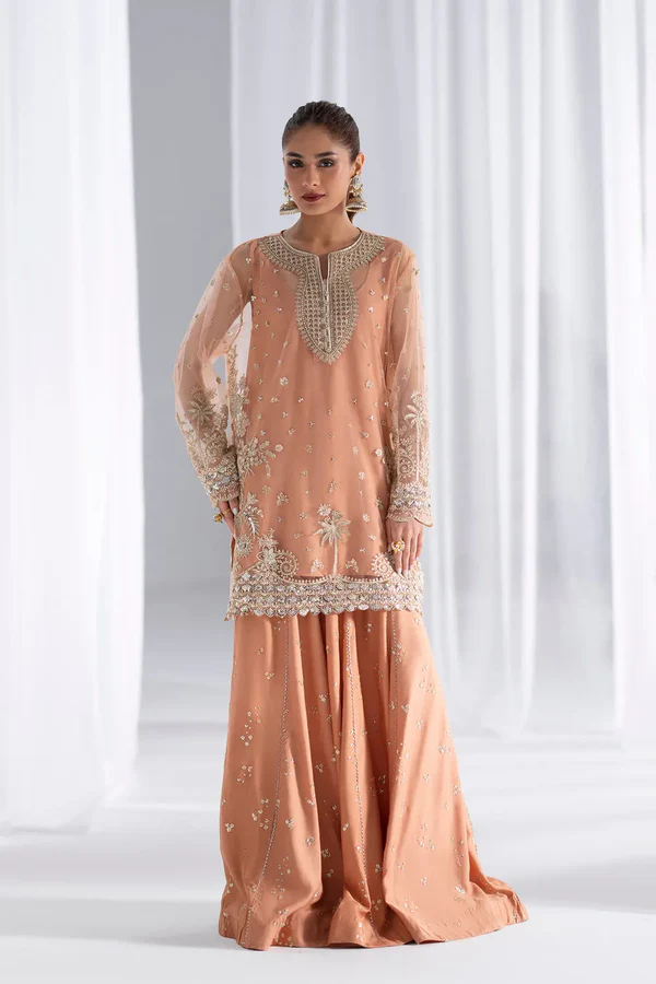 Step into luminous sophistication with this stunning pastel embroidered ensemble. The short-length kurti, crafted from soft net in a delicate pale coral shade, is adorned with silver and gold floral threadwork and shimmering sequins across the front, neckline, and hem for a festive touch. The long sleeves are equally embellished, adding to its refined charm. Paired with a matching voluminous, flowy sharara, the look is elevated by wide-leg trousers finished with ornate gold-toned sequin detailing for a dramatic, opulent silhouette. This suit is a truly luxurious choice for any celebratory occasion.