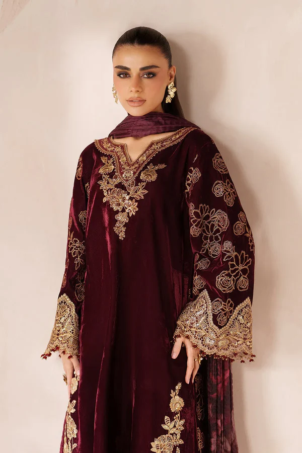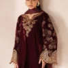 Elevate your wardrobe with this stunning three-piece ensemble featuring luxurious embroidered velvet craftsmanship. The intricately detailed shirt showcases rich embroidery on sumptuous velvet fabric, paired with comfortable grip trousers designed for all-day wear. Complete your look with a beautifully digital printed silk crush dupatta that adds elegance and versatility. This comprehensive set includes coordinated accessories to perfect your styling. Ideal for special occasions or elevated everyday wear, this collection brings together premium fabrics and thoughtful design for a truly sophisticated appearance.