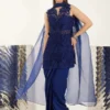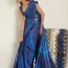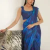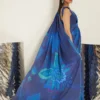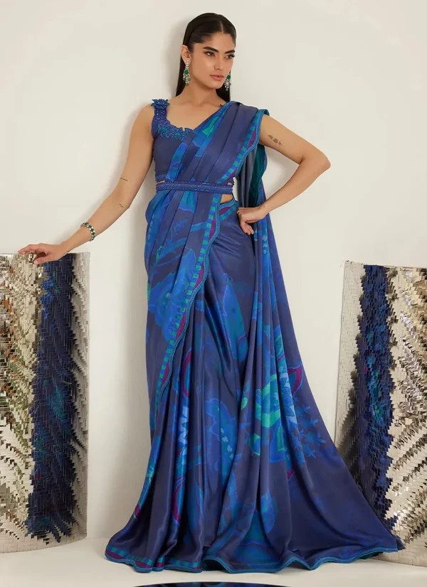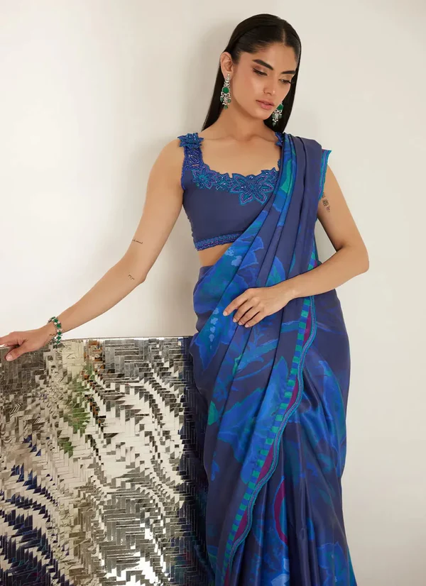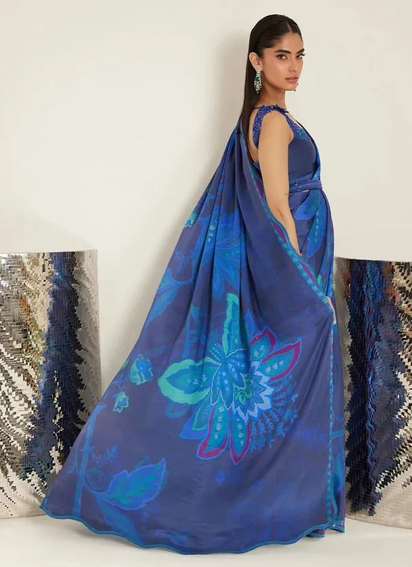 This striking ensemble features a printed draped sari paired with a delicately structured blouse, creating a silhouette that is both sculpted and fluid. Rendered in rich shades of blue, the sari is adorned with bold botanical-inspired prints, adding depth and movement to the look.