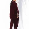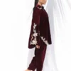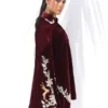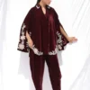 Rendered in deep burgundy velvet, this cape kurta is a study in modern regality. The flowing silhouette features slit sleeves adorned with pastel resham florals, appliqué details, and metallic zardoze accents that shimmer softly against the plush base. Paired with a matching velvet balloon shalwar, the ensemble is an ode to contemporary femininity.