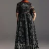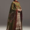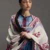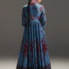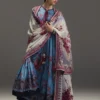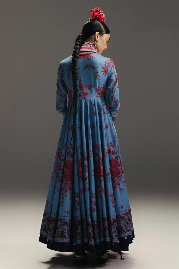 Falak Ara is a graceful Anarkali composition crafted in breathable, high-thread-count Pima lawn in a soft, ethereal light blue that evokes the serenity of an open sky. The bodice, panels, and sleeves are adorned with delicately scattered floral clusters, subtly anchored by a vibrant red botanical border at the hem that lends striking contrast and definition to the flowing fourteen-panel silhouette. Paired with digitally printed maroon cambric trousers featuring a continuous running floral pattern, the ensemble achieves a rich and grounded depth. The look is completed with a pristine cream silk dupatta detailed with an intricate floral jaal spray, adding vintage refinement and timeless elegance to this contemporary yet regal design.
