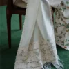 - Ivory, tissue silk with floral spraywork, two sides organza borders, enhanced print detail, laces and tassel detail, four-sided lace border.