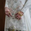 - Ivory organza over shirt with embroidered embellishments, printed silk slip underneath (scoop neckline), round neckline overshirt, fitted sleeves, lacework on hem, sleeves and neckline.