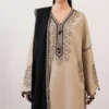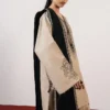 FÉRA — defined by quiet drama, this ensemble unfolds in soft beige, anchored by striking black embroidery tracing the neckline and sleeves with artisanal precision. The relaxed kurta silhouette flows with ease, layered for winter warmth without losing its structured grace.