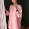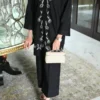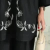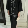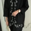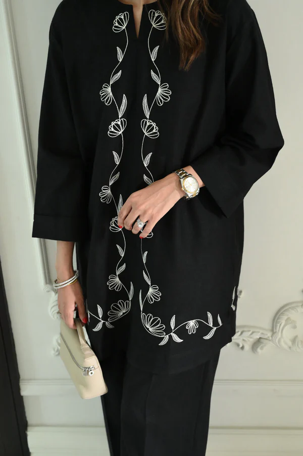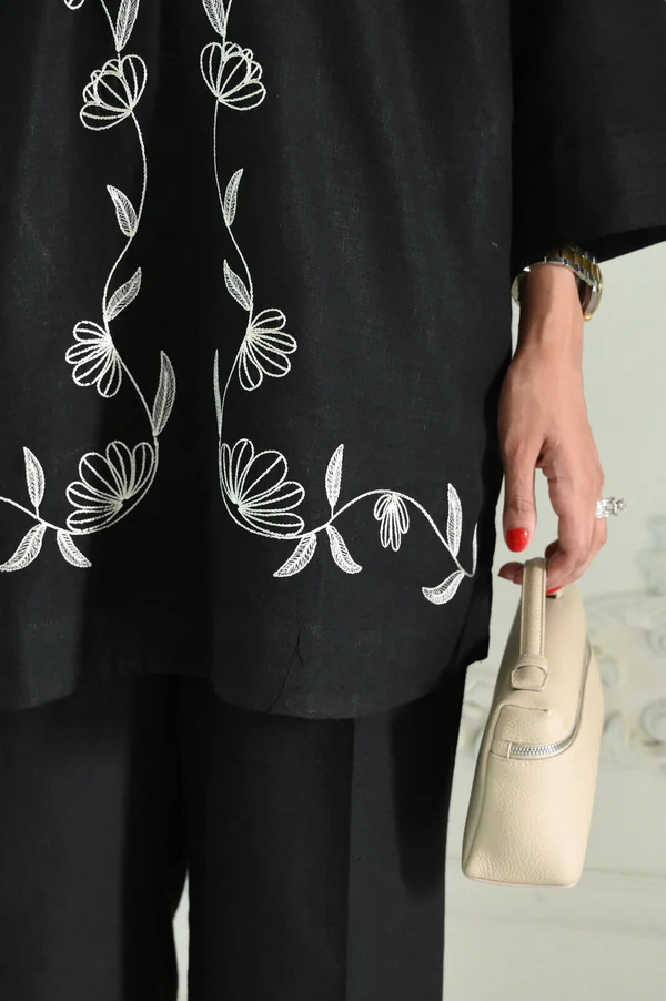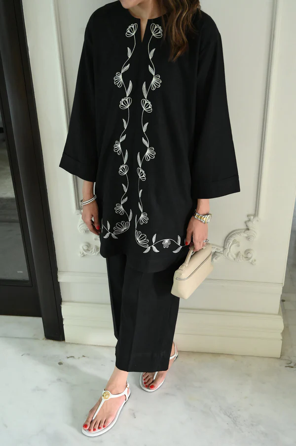 A two-piece solid black outfit featuring a relaxed-fit kurta adorned with delicate white floral embroidery running vertically along the front panel. It is paired with wide-leg trousers in a matching solid hue for a timeless and graceful look.