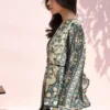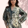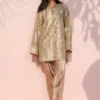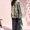 A striking asymmetric jacket stands out with its richly detailed botanical and tapestry-inspired print. Set against deep ebony, wide sand-toned panels frame expressive avian and floral motifs, creating a vivid contrast. The fluid silhouette is drawn in at the waist with a handcrafted rope belt, allowing the fabric to drape elegantly over an ebony crepe slip. Paired with matching ebony crepe trousers, the look creates a layered statement that feels artistic, modern, and luxe.