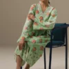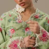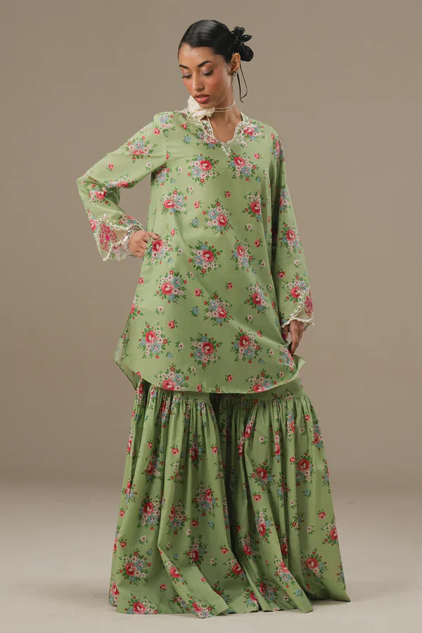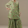 An olive green cambric gharara set featuring a short printed shirt, detailed with delicate embroidery on the neckline and sleeves. Easy to wear and effortlessly stylish, this set brings a fresh, modern twist to traditional silhouettes.