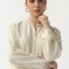 A three-piece ivory linen suit with a matching shawl, featuring a classic kurta adorned with delicate embroidery along the slits for a timeless, elegant look.