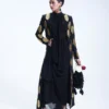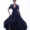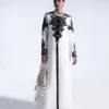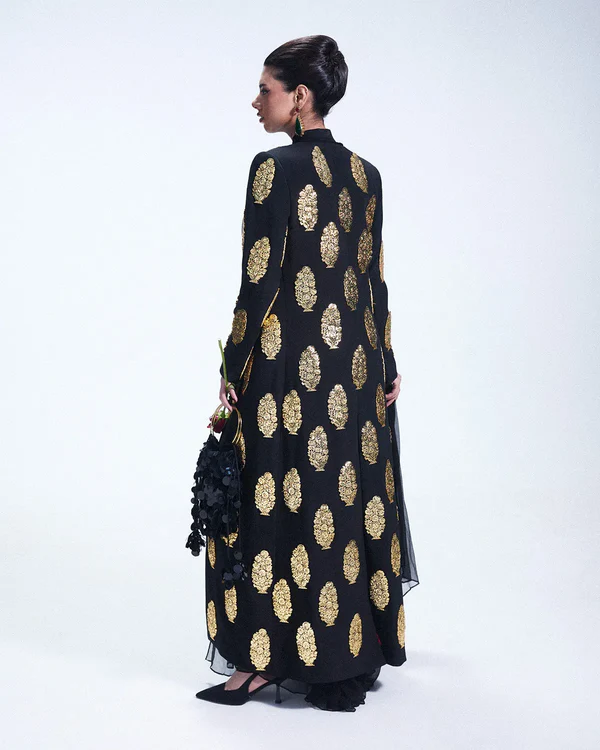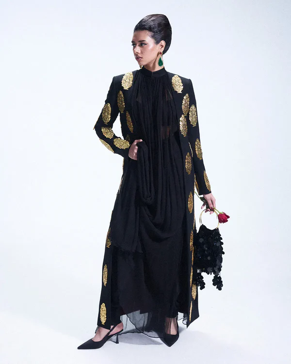 A long tailored black coat adorned with custom metal jewels placed on the base. Layered under is a long shiffon draped shirt hooked on top flowing gracefully. Paired with fluid harem pants adding graceful movement to the modern yet timeless silhouette. Add on ( Bag is a separate accessory)