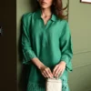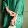 A two-piece solid emerald green outfit featuring a loose-fit kurta with chikankari-inspired scalloped embroidery along the sleeves and floral motifs at the corners of the hem. It is paired with wide-leg trousers adorned with matching scalloped embroidery.