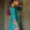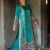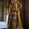 Elegant and refined, this green long straight kameez in pure raw silk features a striking asymmetrical neckline and is paired with charming crushed silk sharara pants. The kameez is adorned with colored resham embroidered organza patches at the hem and sleeves, framed by block-printed borders along the edges. Intricate gota work and zardozi embellishments add a touch of luxe, while Indian golden gota kingrees and contrasting pink maghzis complete the design. The sharara pants echo this detailing, with Indian gota lapas and pink maghzis at the hem.