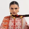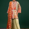 A digital-printed fusion of paisley and Mughal art in blush, terracotta, and orange, paired with a paisley rotary-print dupatta and matching pants.