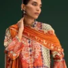 A digital-printed fusion of paisley and Mughal art in fern, sage, fire, and tangerine, paired with a paisley rotary-print dupatta and matching pants.