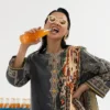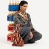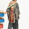 Trellis block-print shirt in beige on grey, paired with a multi-colored Turkish-architecture block-print dupatta and matching pants.