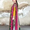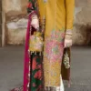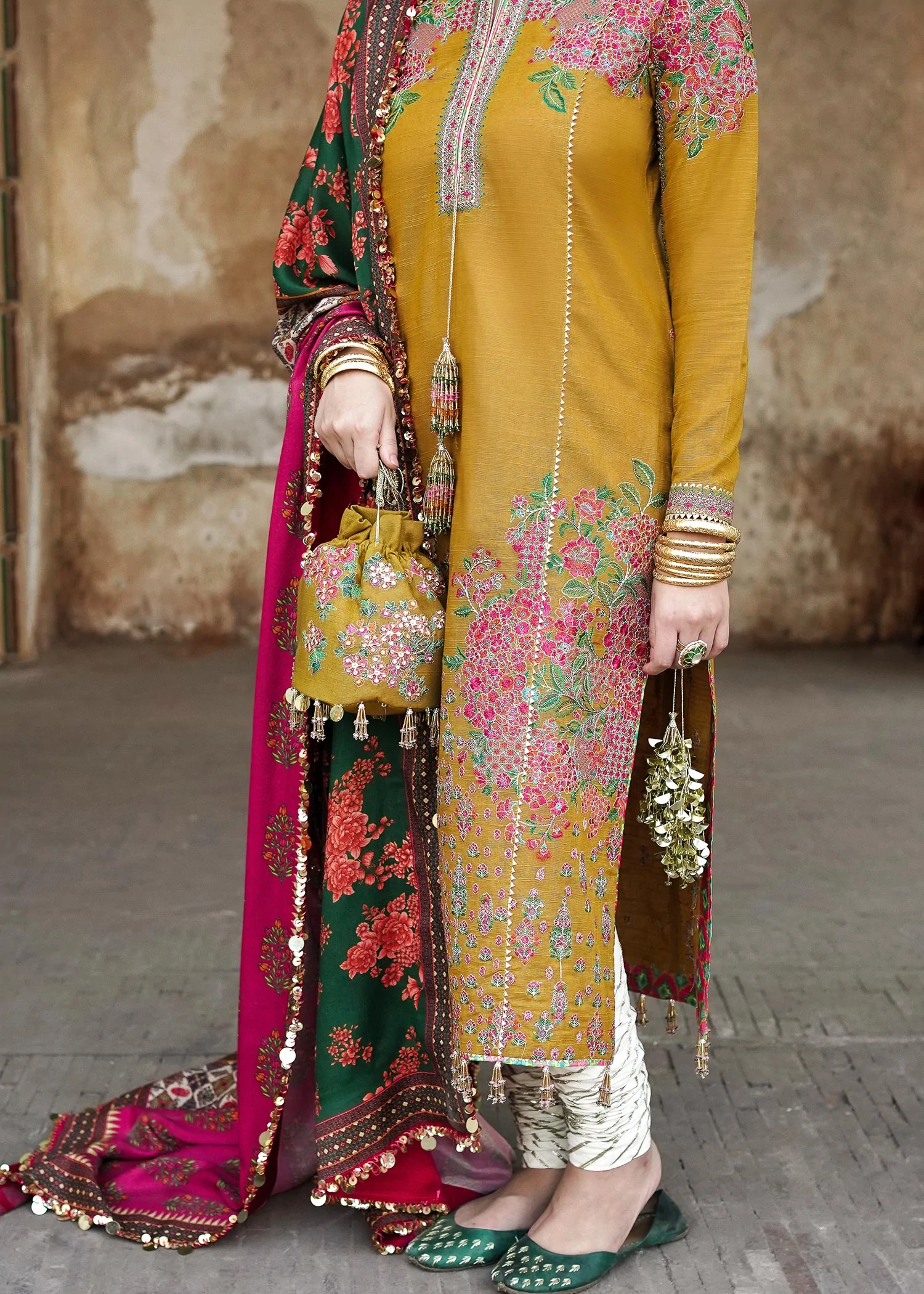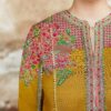 Hana – this mustard shirt is made curated on kaddar, donned with hot pink, orange, green, blues, and gold floral motifs. Paired with ivory trouser and printed woolen shawl.
