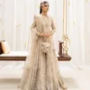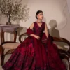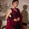 A portrait of classic sophistication, Havin reimagines heritage charm through a contemporary lens. Crafted on opulent Shamose silk in a captivating dark magenta pink hue, the printed and embroidered shirt silhouette flatters with its voluminous silhouette and elongated lines. Paired with an embroidered organza and net dupatta and silk trousers, this piece is truly one-of-a-kind, making it a must have in your festive wardrobe.