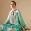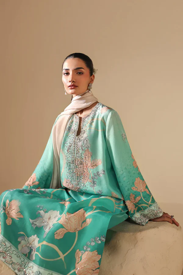 Radiating freshness and refined elegance, this AMMARA KHAN ensemble features a long, turquoise shirt with a floral print in pastel tones. The front and neckline is hand-embellished with crystals, sequins, and bead work, and the sleeves end in embellished cuffs. The shirt is paired with matching printed pants and a pot-dyed blush-toned dupatta with tonal borders, making it ideal for festive and formal Eid occasions.