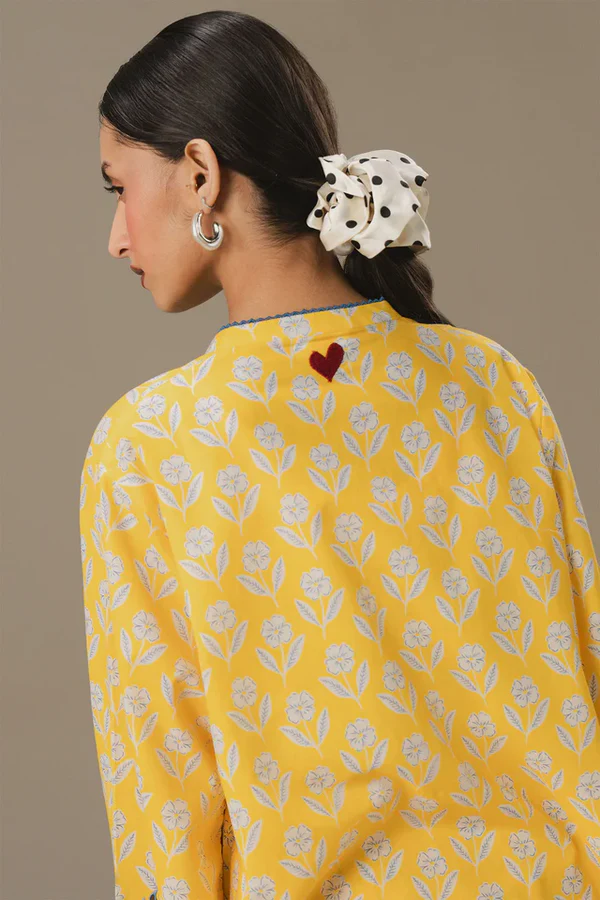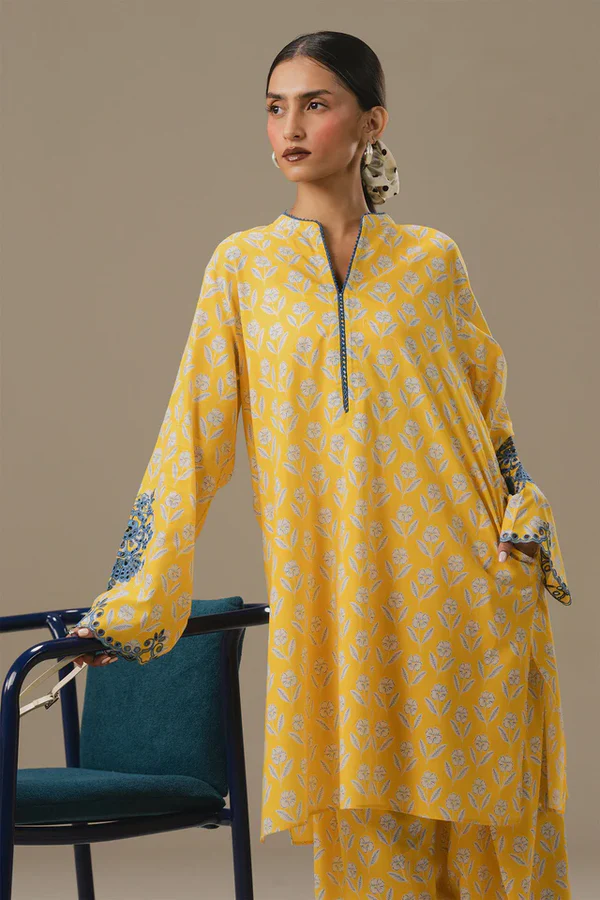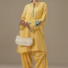 A sunny yellow cambric shirt with delicate embroidery on the sleeves, paired with a matching cambric shalwar for a relaxed, graceful silhouette. Soft details and easy lines make this set perfect for everyday, effortlessly stylish looks.