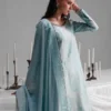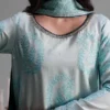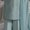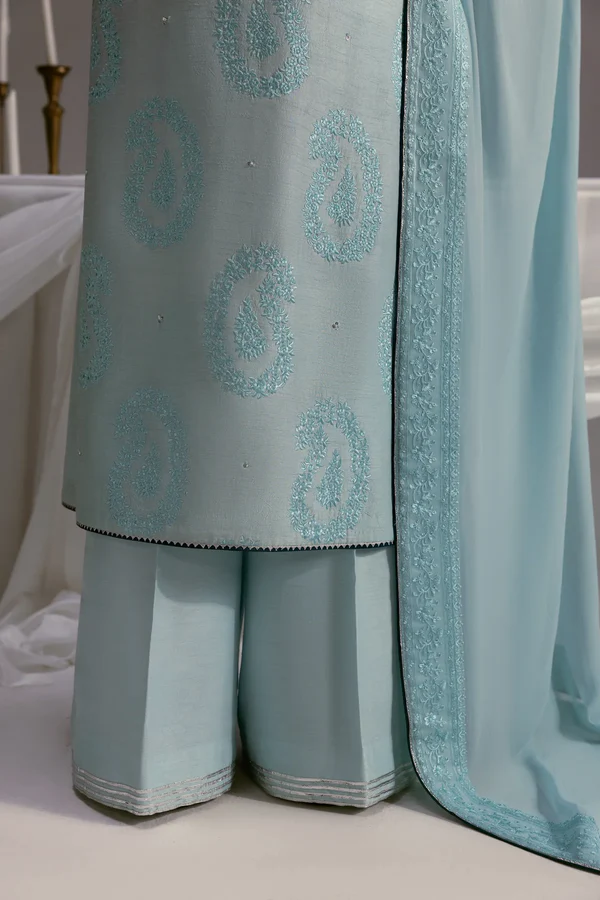 This enchanting ice blue ensemble is crafted from luxurious embroidered raw silk, adorned with intricate silver sequins, bugle beads, naqshi, and gota embellishments around the neckline and sleeve cuffs. The refined detailing adds a subtle shimmer, enhancing the outfit’s timeless appeal. It is paired with elegant palazzo pants featuring delicate gota accents, creating a harmonious and graceful silhouette. Completing the look is an embroidered chiffon dupatta, radiating classic charm with its airy elegance. Perfect for weddings, festive celebrations, and formal soirées, this design blends sophistication, tradition, and understated glamour.
