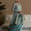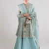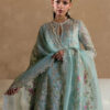 - An aquamarine organza paneled angharaka peplum with crew keyhole neckline, tassel detail, gold and beige lace, fitted sleeves, cutwork, and sequin-edged floral screen print.