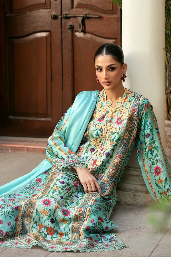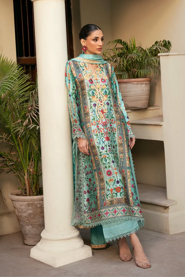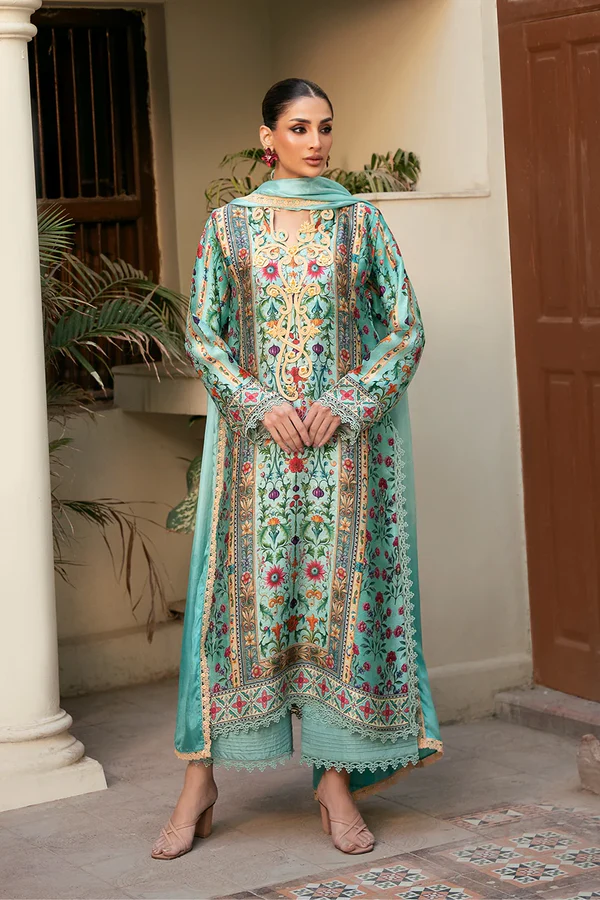 A kaleidoscope of magenta, aubergine and tangerine hues come alive on this exquisite kurta crafted from embossed silk. Fine stitching detail and embroidered florals cascade down the neckline and lend a mystic aura to the shirt. Pair it with a two tone silk dupatta for a head turning look this season!