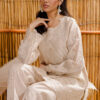 An ivory khaddi silk cord set featuring a cutwork crew neckline and bell sleeves for a balanced blend of structure and fluidity. The bootcut pants are finished with Schiffli embroidery, cutwork, and appliqué detailing, creating depth and texture throughout the ensemble.