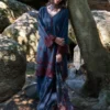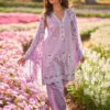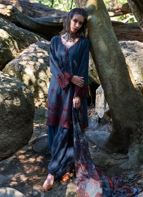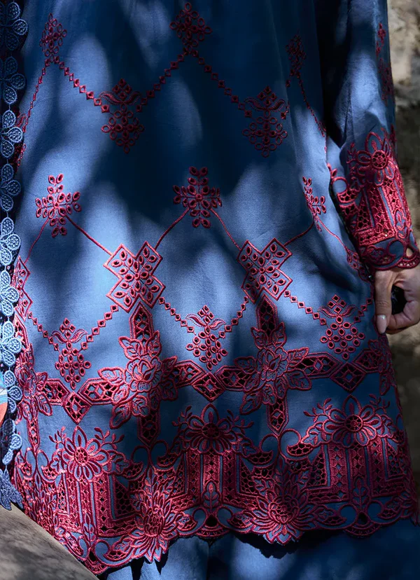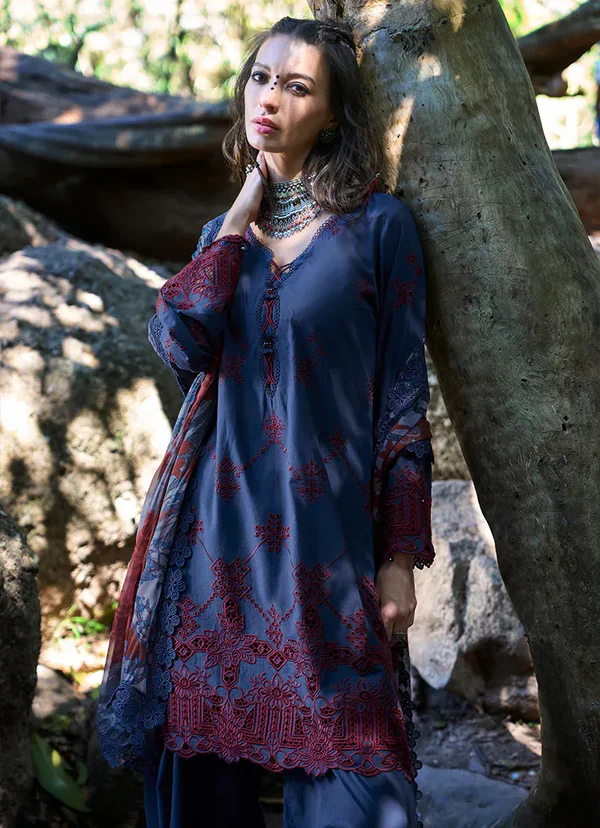 This unstitched pure cotton lawn shirt is crafted in a deep navy-blue shade, featuring contrast-toned geometric and floral motifs arranged in a structured, all-over fabric pattern. The design is accentuated with richly detailed ornamental borders that add depth and definition to the surface. Paired with a pure cotton cambric trouser and a chiffon dupatta showcasing complementary prints, the ensemble presents a breathable composition with bold visual character, suited for refined summer styling.