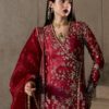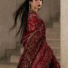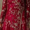 - A wine red organza angrakha-style front-open shirt with overlapping V-neckline, gold and silver embroidery, lace accents, and front tassel.