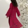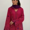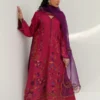 Jasmin is a contemporary festive ensemble designed to make a statement this Eid. Crafted in striking magenta khaadi silk, the shirt features multi-resham embroidery with cutwork accents and appliques. Paired with a sheer organza dupatta, detailed with all over embroidery and delicate lace finishing, this outfit is perfect for Eid gatherings, festive dinners, and special occasions.