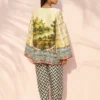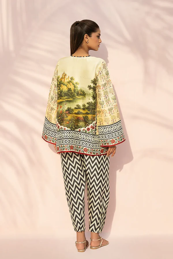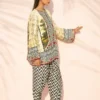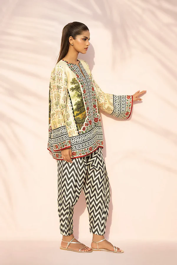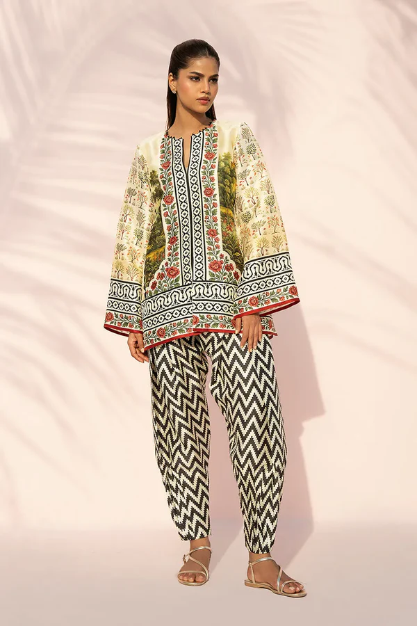 An elevated printed ensemble in pure rawsilk, set on a soft pistachio base and detailed with intricate botanical motifs. Graphic borders in ebony and ivory, accented with pops of crimson, frame the neckline, sleeves, and hem with crisp definition. Paired with a contrasting chevron printed shalwar, the look feels modern and composed.