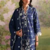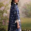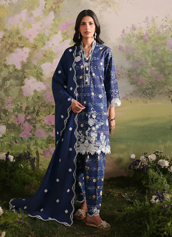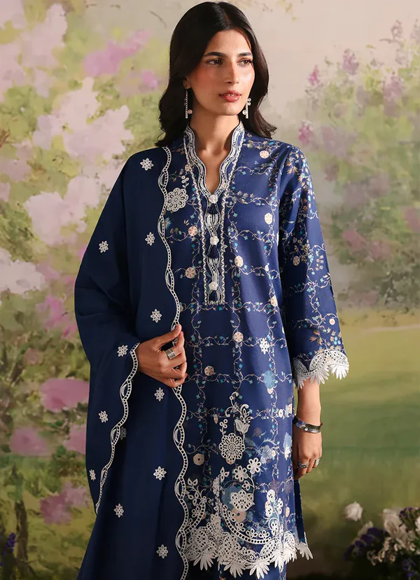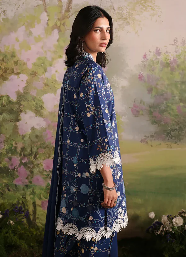 Jollyn is a rich blue unstitched 3-piece suit crafted in printed cotton, featuring intricate floral motifs in soft ivory and subtle gold tones that beautifully contrast the deep base. The shirt is enhanced with an embroidered neckline, front, back, and sleeves, finished with delicate border detailing for a refined look. The printed trouser complements the design, while the dyed voile dupatta with embroidered pallu borders adds fluidity and an elegant, graceful finish.